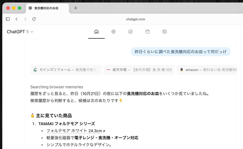 「昨日Amazonで調べた食器なんだっけ」と聞いてみると、閲覧履歴から、関連する情報をChatGPTが探し出し、瞬時に要約して表示してくれた。