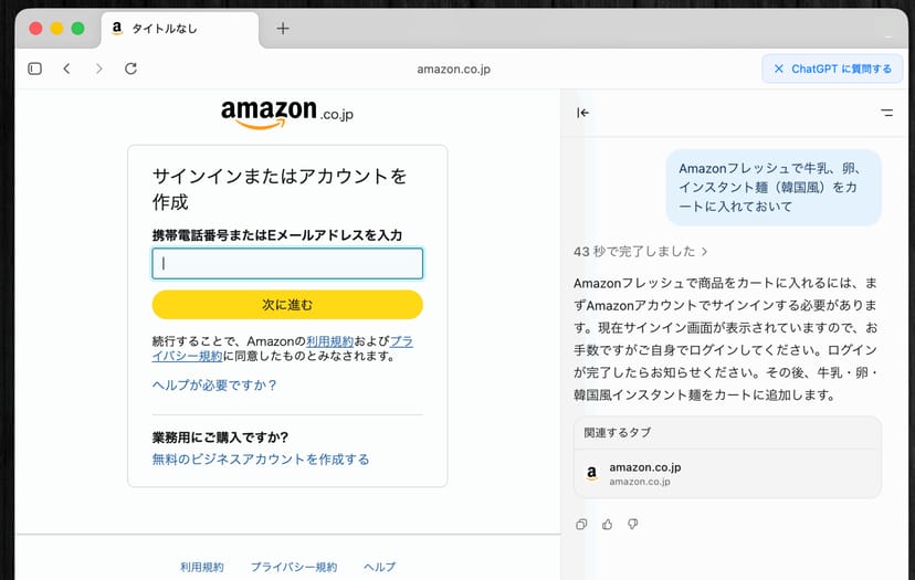 Amazonフレッシュは、ログインユーザーしかカートを操作できないので、それに気づいたChatGPTが、ちゃんとユーザーに「ログインしてください」と依頼してきた。ログイン画面まで連れてきてくれているので、人間はログインパスワードを入力すればいいだけだ。