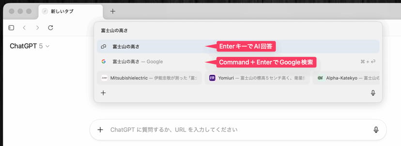 Atlas におけるデフォルトの検索は、全てChatGPTとのチャットが起点になっている。