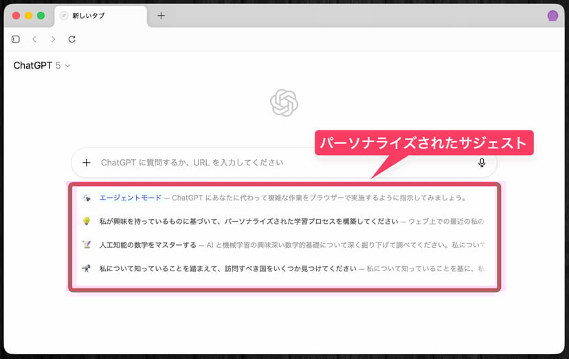 ChatGPT Atlas では、従来からChatGPTが有しているメモリ機能や、ブラウザの閲覧履歴へのアクセスを活用して、よりパーソナライズされたAIとの会話や、次のアクションの提案を受けることが可能だ。