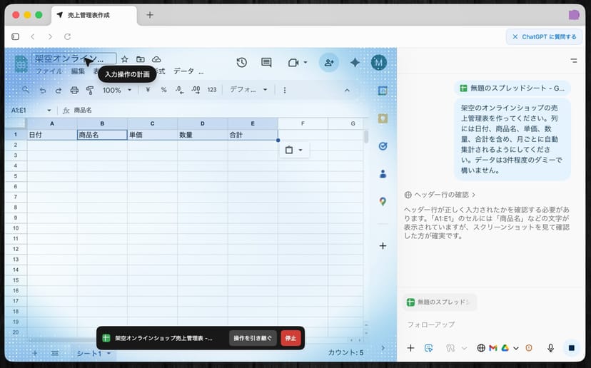 筆者もここ数日、Atlas のエージェントモードをリサーチ、商品探し、スプレッドシート作りなどで実際に使ってみた。