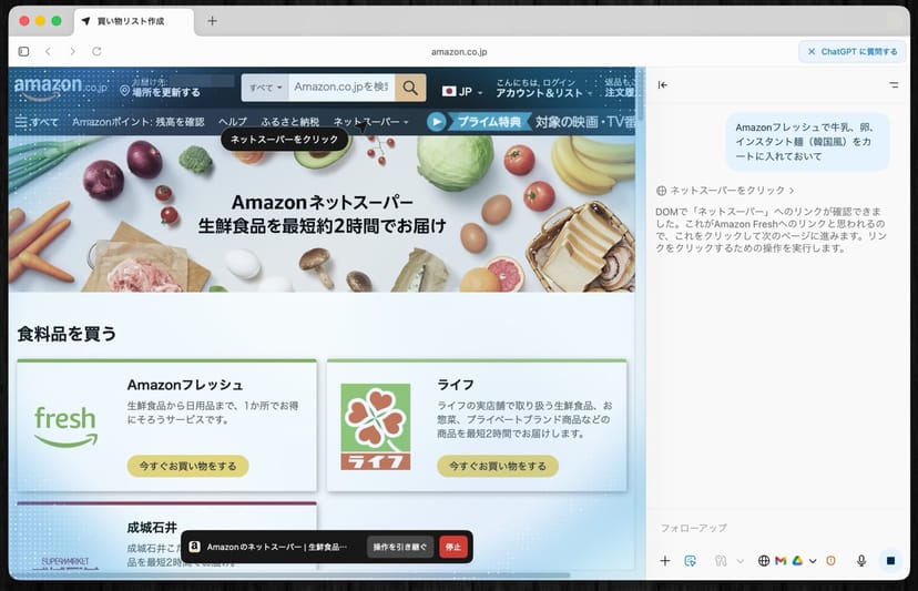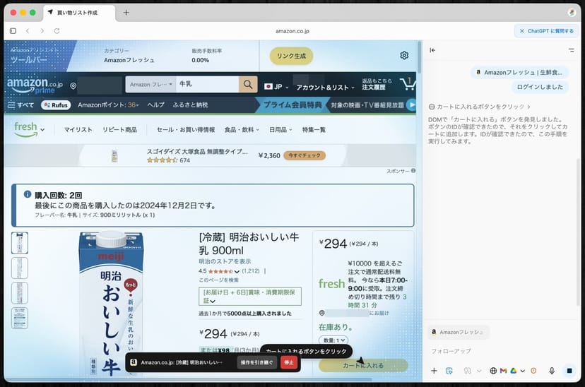 すると、エージェントがAmazonのページを勝手に開き、Amazonフレッシュにアクセスしてくれた。