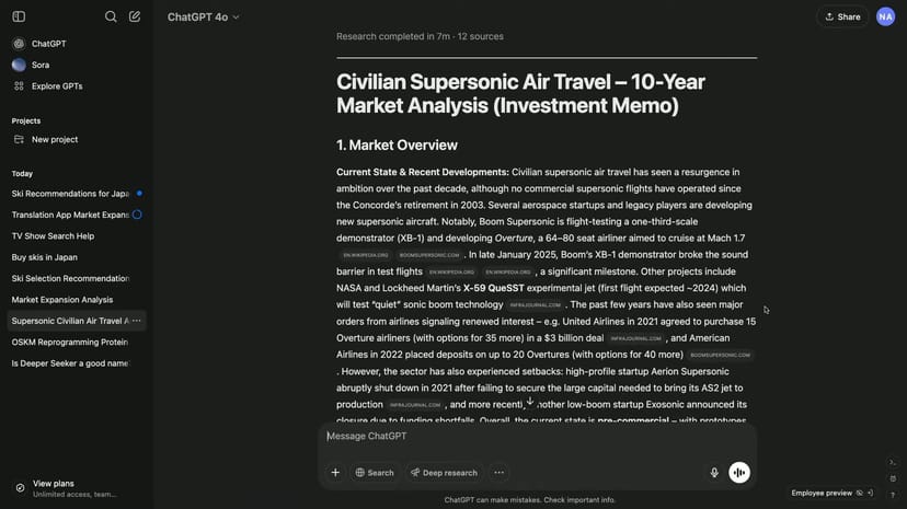 たとえば、シリコンバレーのVCファーム向けに民間超音速旅客機市場の投資メモを作成する例が示された。