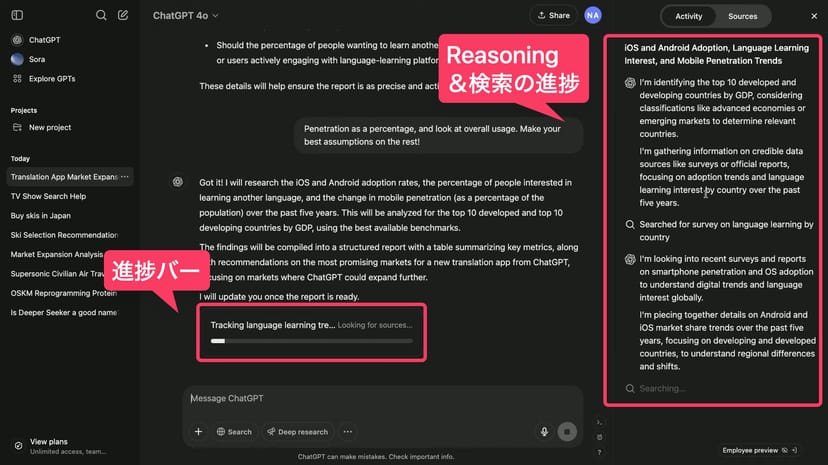 画面右側には、o3がどのような思考ステップを踏んで、リサーチを実行しているか、進捗が表示される。