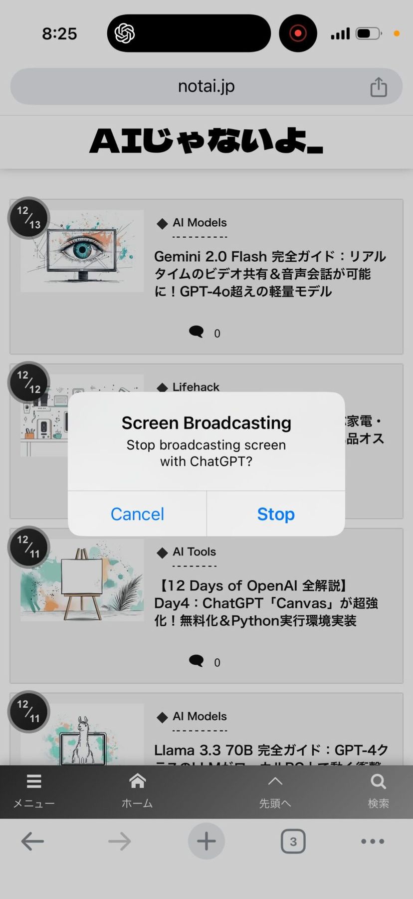 その6日目(12月13日)のライブ配信で、ChatGPTの「音声モード」のアップデートが発表され、カメラの映像をリアルタイムで読み取らせたり、スマホやPCの画面をリアルタイムで共有したりすることが可能になった。