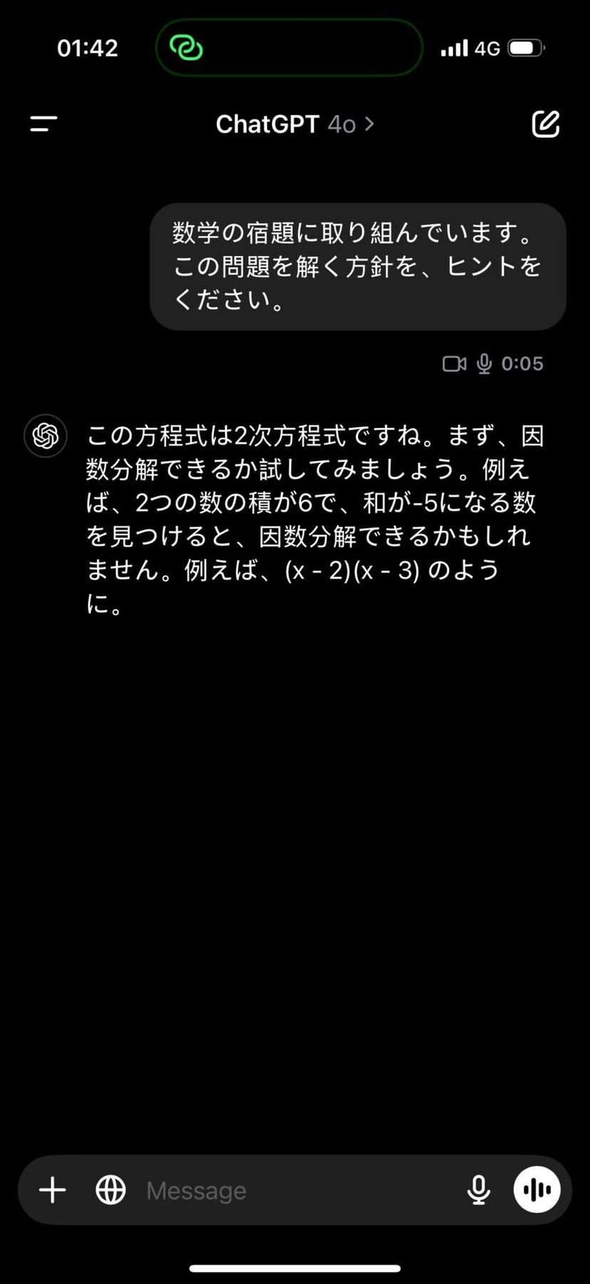 子どもに数学の勉強を教えてあげる時間がなくても、ChatGPTにカメラでノートを見せながら、宿題についての質問をすれば、的確にChatGPTが回答してくれる。