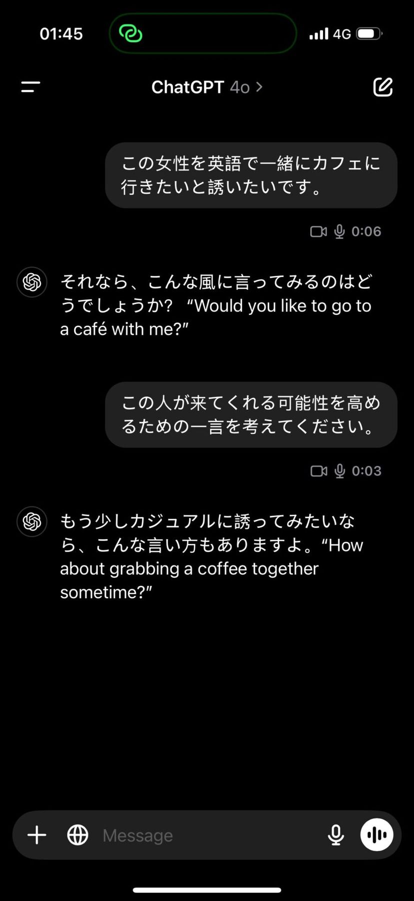 実際に、女性をカフェに誘うのに適した英語を聞いてみると、いろいろと考えてくれた。