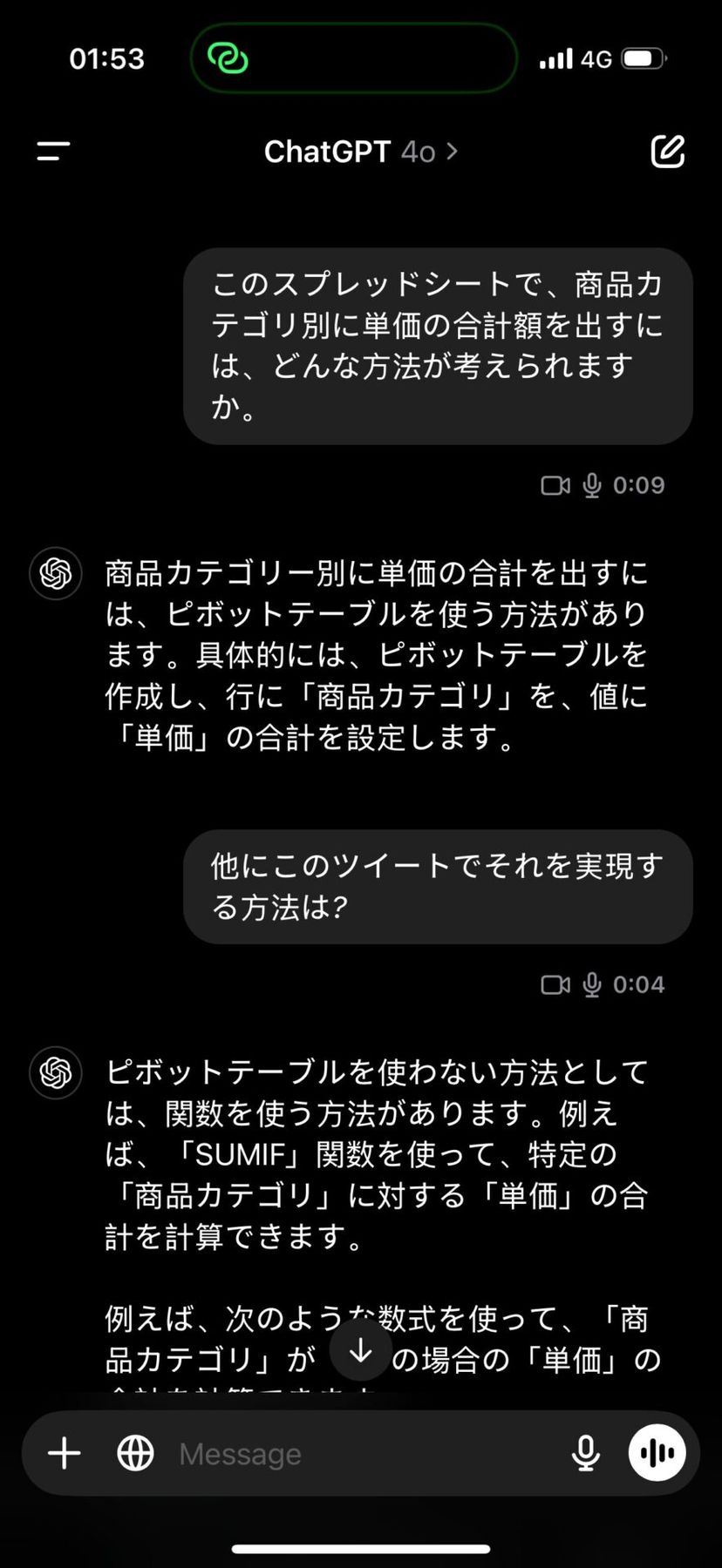すると、ピボットテーブルを使う方法や、SUMIF関数を使う方法を、音声で丁寧に解説してくれた。