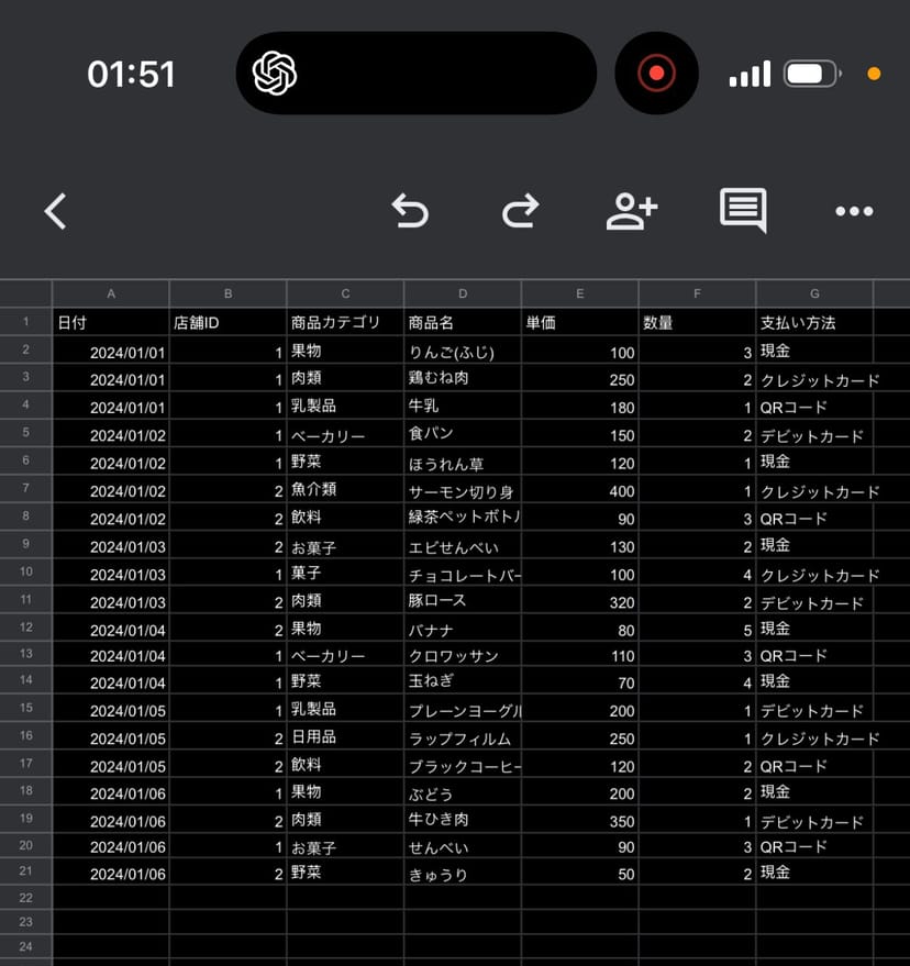 例えば、以下のような商品売り上げデータのサンプルを用意して、スクリーンを共有しながら、商品カテゴリごとの売上合計額を計算する方法を尋ねてみた。