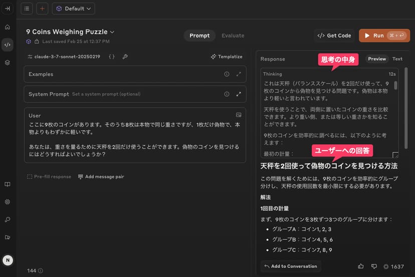 この思考の過程は、「Chain-of-Thought」などと呼ばれ、モデルが独り言を喋りながら思考を深めていくプロセスだが、Claude 3.7 Sonnetでは、このCoTを覗き見ることもできる。