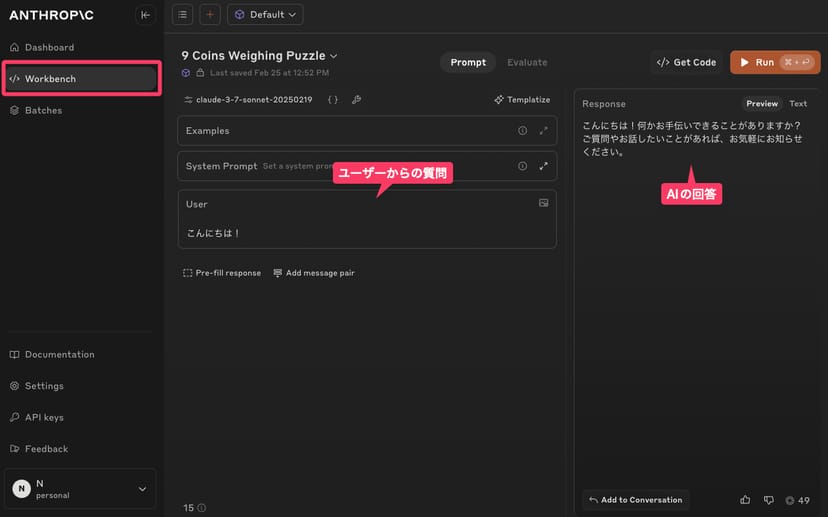 自分でコードを書かなくとも、Anthropicの開発者向けページからAPIアカウントを作成し、「Workbench」というテスト画面を使えば、使いやすいチャット風のインターフェースで、Claudeとのチャットが可能だ。