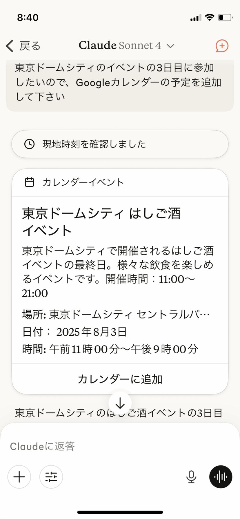 東京ドームシティのイベントの3日目に参加したいので、Googleカレンダーの予定を追加して下さいすると、Claude が日付・時刻・場所・概要などを自動で作成したカレンダーイベントを作成してくれるので、「カレンダーに追加」をタップするだけで、カレンダーに予定を追加できる。