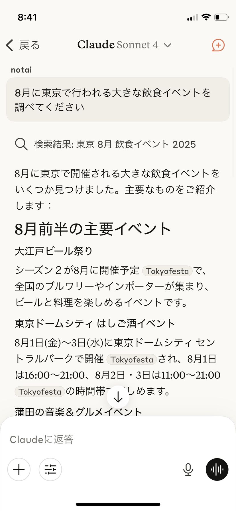 まずは、8月に行われるイベントの予定をClaudeに調べてもらった。