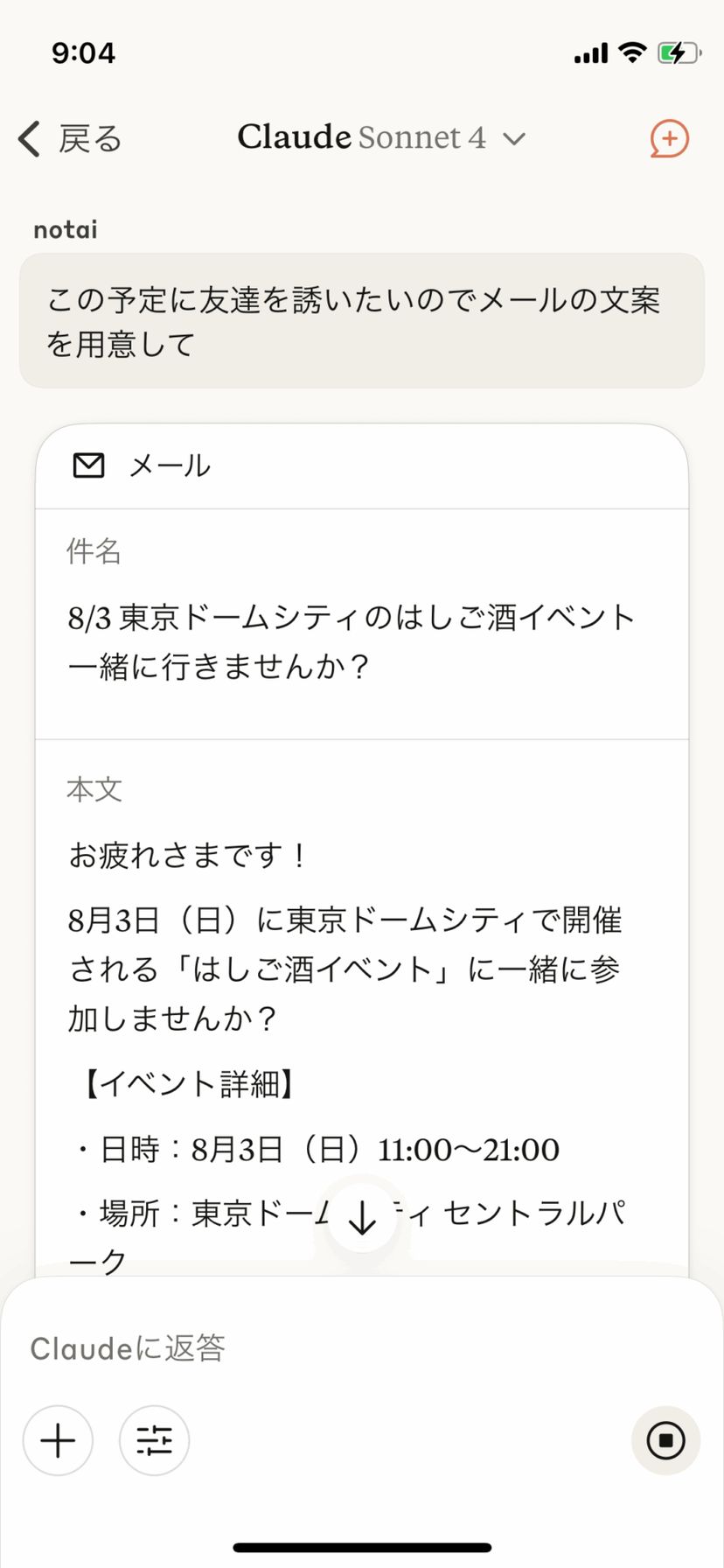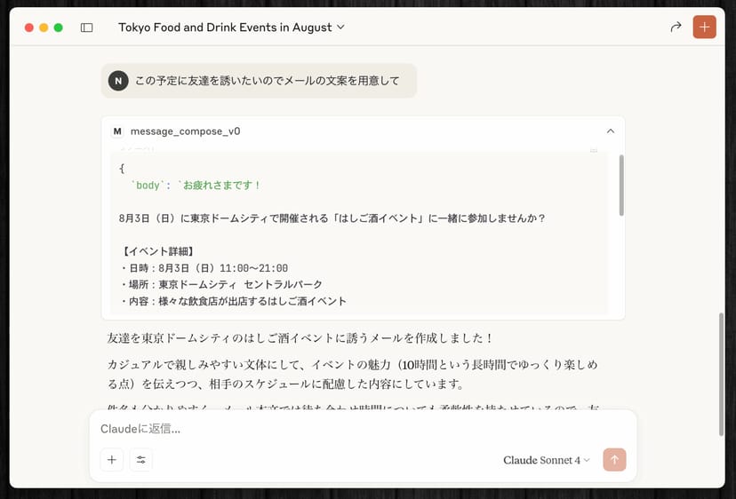 この予定に友達を誘いたいのでメールの文案を用意してこのプロンプトだけで、Claude がメールの件名や本文を瞬時に生成してくれる。