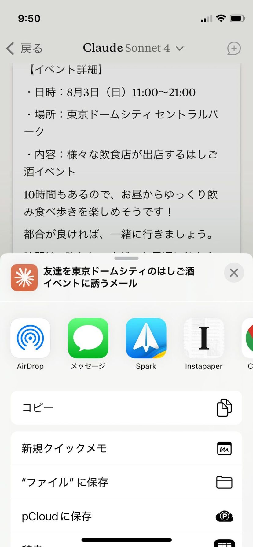 iPhoneの場合は、Claude の作成してくれたドラフトを、ワンタップで iMessage で送信したり、各種メールアプリで送信したりすることができる。