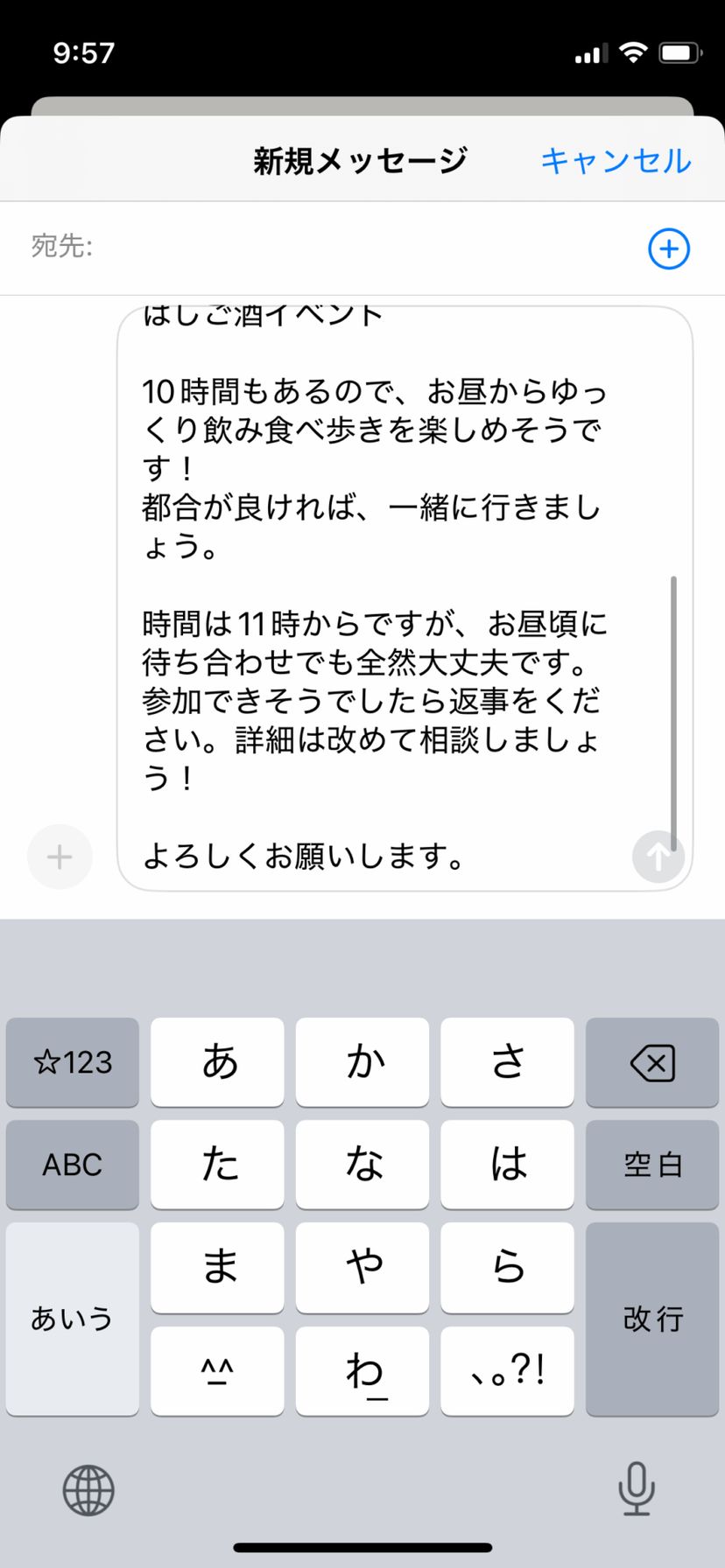 例えば、先ほどのチャットから続けて、イベントに友達を誘うためのメッセージの文案を作成してもらう。