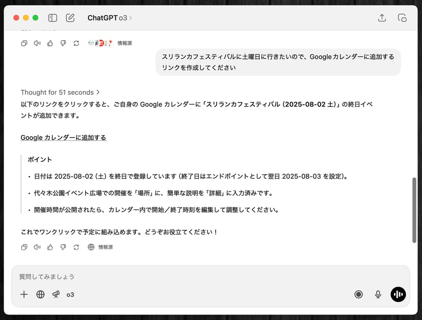 試しに、Claude の場合と同様、ChatGPTに東京の飲食イベントを調べさせ、それをGoogleカレンダーに追加するリンクを作らせてみた。