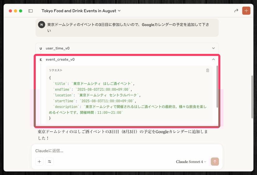 その上で、event_create_v0というツールを呼び出し、JSON形式で予定のタイトルや場所、日時情報を整理している。