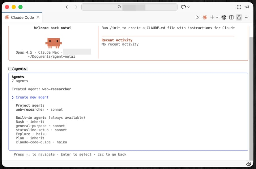 Claude Codeの/agentコマンドで、「Create new agent」を選ぶと、プロジェクトの .claude/agents/ ディレクトリに新規のカスタムエージェントを作成できる。