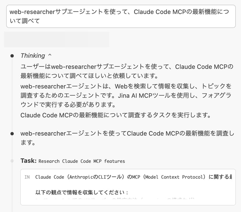 web-researcherサブエージェントを使って、Claude Code MCPの最新機能について調べてClaudeは自動的にこのサブエージェントをフォアグラウンドで起動し、Web検索を実行する。検索結果の詳細はサブエージェントのコンテキストで処理され、メインの会話には要約のみが返される。