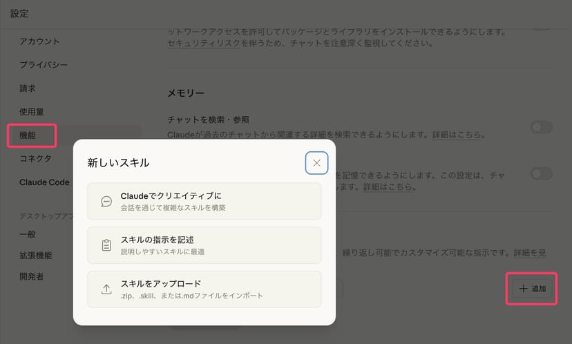 Pro・Max・Team・Enterpriseプランでは、ユーザーがオリジナルのスキルを作成することもできる。Claudeに新規スキルを作成させることもできるので、専門知識がなくとも拡張可能だ。
