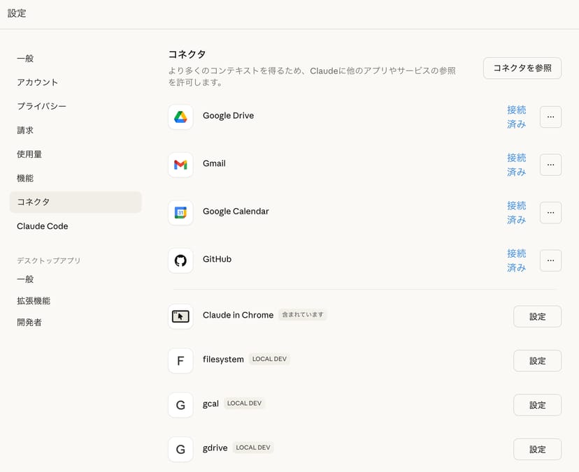 - GSuiteコネクタ非対応:公式ヘルプによると、CoworkではGSuiteコネクタ(Gmail、Googleカレンダー、Google Drive)に対応していない。Claude Chat側で有効化済みでも、Coworkからは利用不可