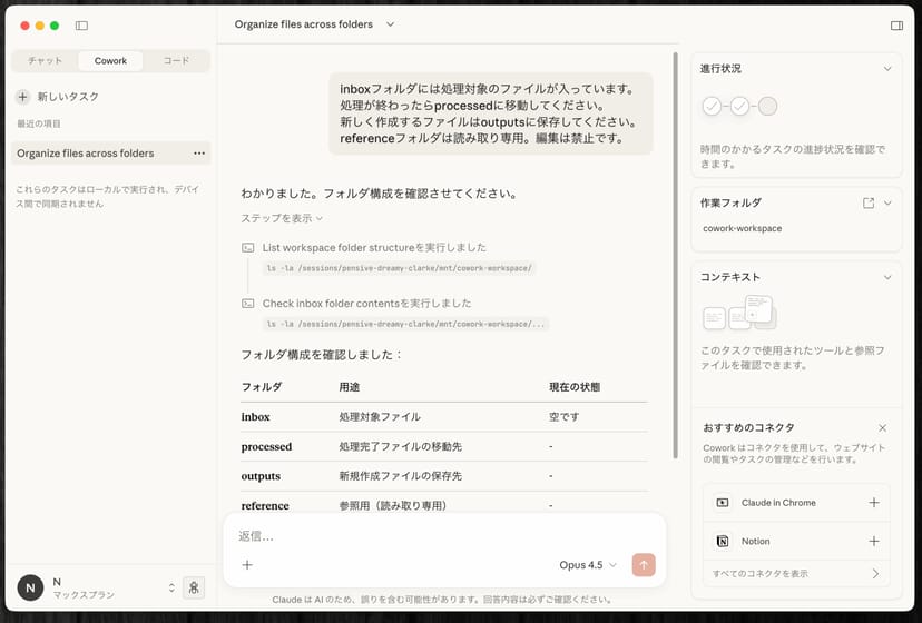 inboxフォルダには処理対象のファイルが入っています。処理が終わったらprocessedに移動してください。新しく作成するファイルはoutputsに保存してください。referenceフォルダは読み取り専用。編集は禁止です。このプロンプトを与えると、Coworkがフォルダ内を探索し、Inboxなどのサブフォルダに何が入っているかを確認してくれる。