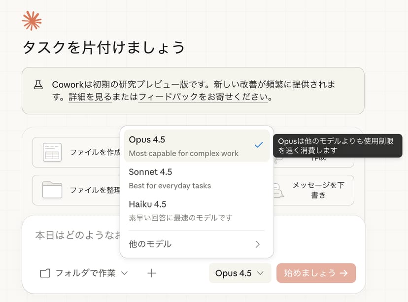 また、Coworkでは使用するAIモデルを「Opus」「Sonnet」「Haiku」から選択できる。Opusが最も高品質だが、その分トークン消費も大きい。