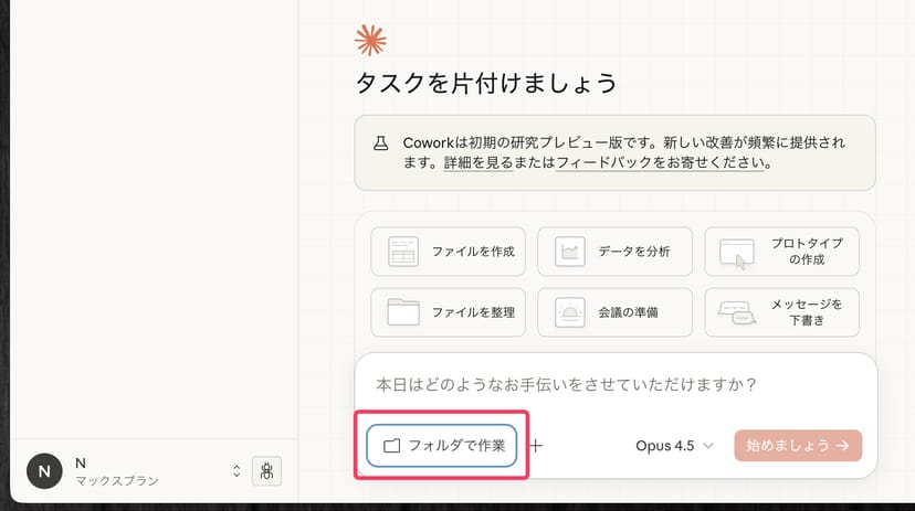 Coworkのウィンドウの下部に、「フォルダで作業」というボタンがあるので、それをクリックして、作業して欲しいフォルダを指定する。