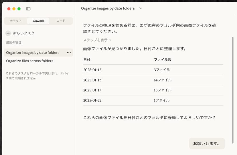 まずは専用フォルダを作成し、ダウンロードフォルダの整理のようなシンプルなタスクから始めてみてほしい。Claudeがファイルを移動し、リネームし、分類していく様子を眺めれば、これが単なるチャットの進化版ではないことが、すぐにわかるはずだ。