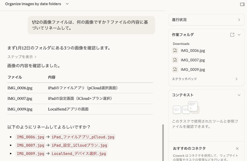 - ファイルの種類ごとにサブフォルダを作成- 「download」や「IMG_」など意味のない名前のファイルは、内容を見て適切な名前に変更Claudeはこのタスクを受け取ると、まず計画を立て、一つずつ実行していく。右側のサイドバーには進捗状況がリアルタイムで表示される。