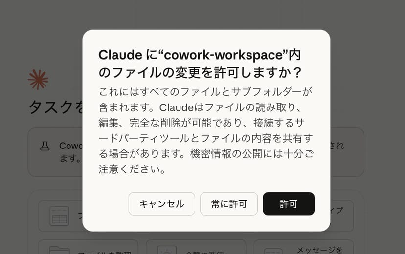 Coworkが作業をすることができるのは、ユーザーがこうして許可を与えたフォルダ内のみである。
