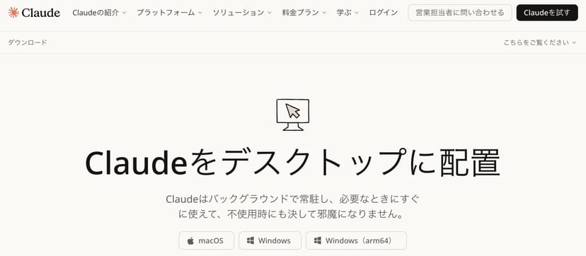 まず、Anthropic公式サイトからClaude Desktopアプリをダウンロードする。