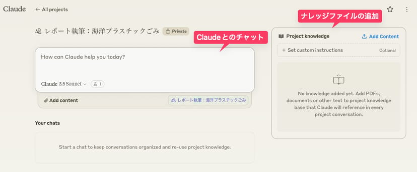 自分が抱えているプロジェクトの関連資料(企画書、プレスリリース、MTGの議事録、メール履歴などなど)をどんどんナレッジとしてアップロードしていけば、Claude 3.5 Sonnetという人類の大半より賢いAIが、プロジェクトの全てを完璧に把握した自分専用の超優秀な部下になってくれる。
