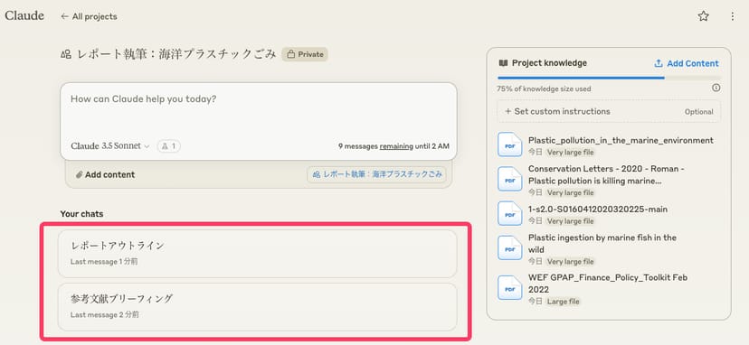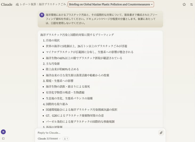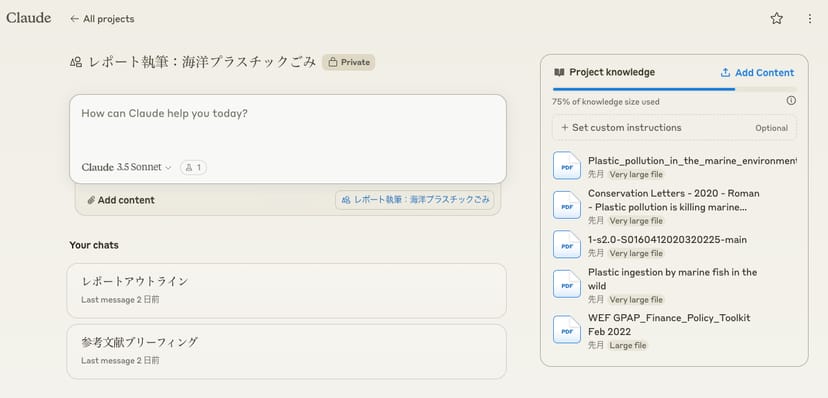 今回の例では、海洋環境に関する学術論文や、世界経済フォーラムのプラスチックに関するレポートなど、長文の英文PDFをナレッジとして与えてみた。