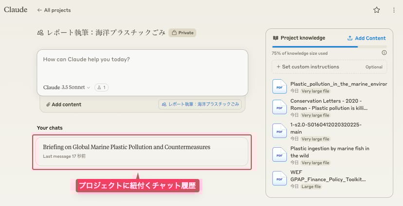 長期にわたるプロジェクトであっても、過去のチャット履歴を一つの場所にまとめることができ、さらにナレッジファイルもどんどん追加・蓄積していける。