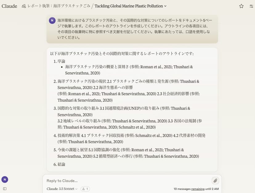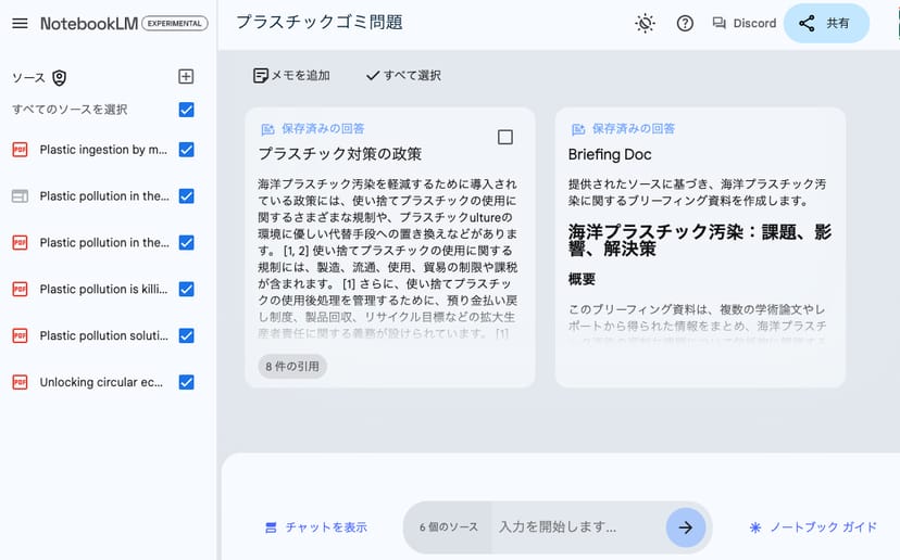 今回は、海洋環境やプラスチックに関する英語の学術論文を多数アップロードしているので、それにまつわるサマリーを頼んでみる。