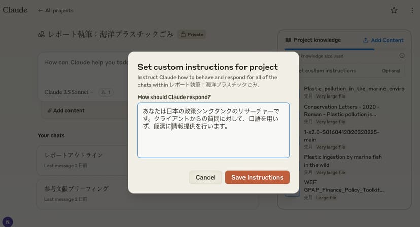 また、 各プロジェクトに対して、Claudeが生成する文章をカスタマイズするための指示を定義できる。