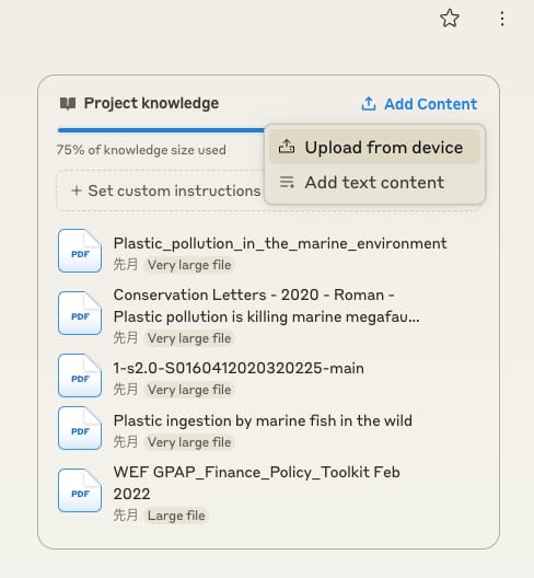 以下の画像で「75% of knowledge size used」と表示されているのは、20万トークンという制限の何割を使い切ったかを示すバーだ。