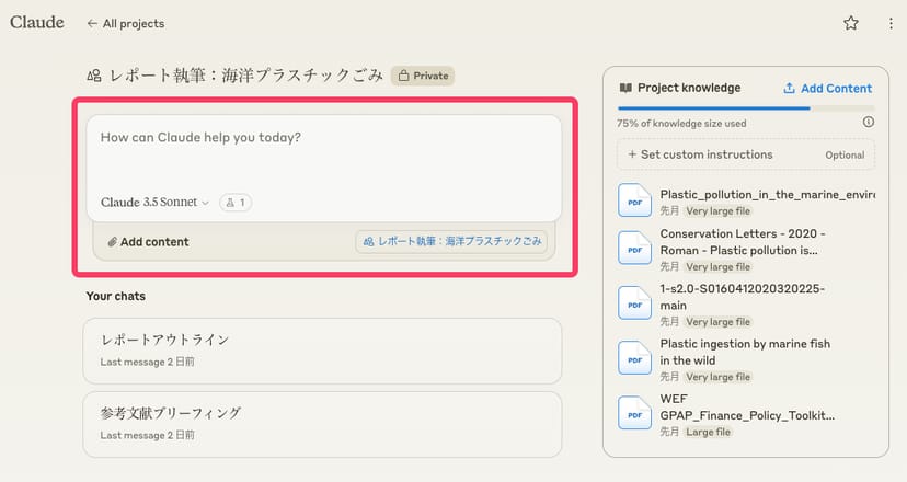 今回は、ビジネスパーソンのリサーチ業務や、大学生のレポート執筆などを想定して、学術論文などを収集してClaudeに読み込ませるプロジェクトを作成する。