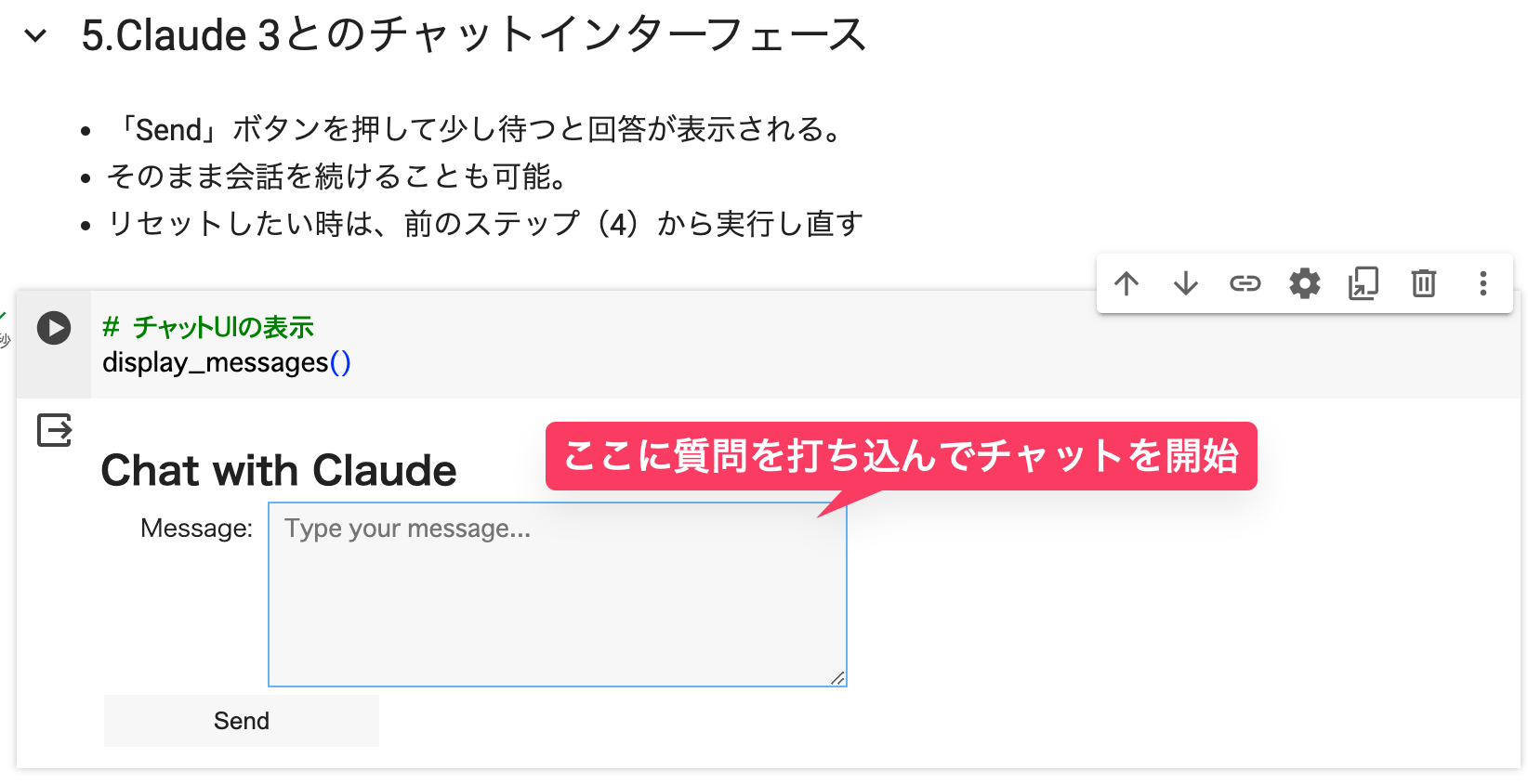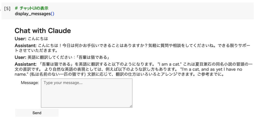 以上でノートブックへのAPIキーの読み込みまでが完了したら、それ以降の見出し「3.使用したいモデルの選択(Opus, Sonnet, Haiku)」「4.Opus, Sonnet, Haikuを呼び出す裏側のコード」「5.Claude 3とのチャットインターフェース」のコードセルを順番に実行していくと、以下のようなチャット用のテキストボックスが表示される。