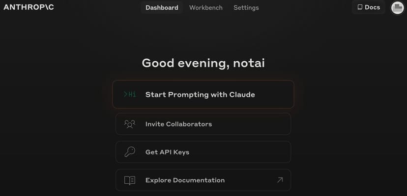 ClaudeのAPIのページにアクセスして、「Get started now」をクリックしてアカウントを作成し、以下のような開発者ダッシュボードにアクセスする。