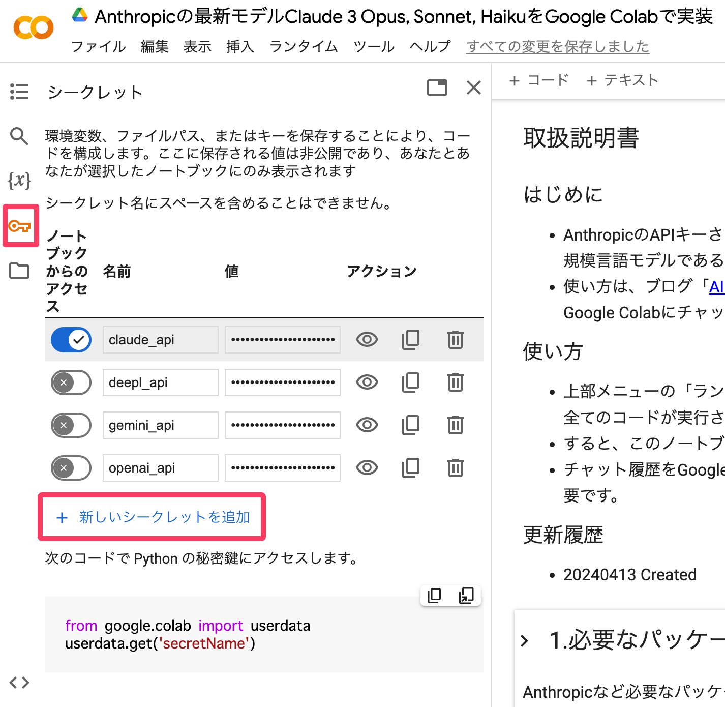 シークレットは、あなたのAPIキーを登録しておくと、後々ノートブックから簡単にそのAPIキーを呼び出せるようにする機能だ。