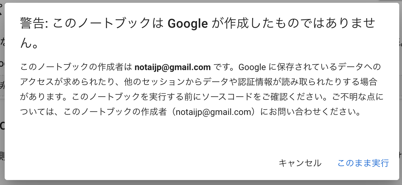 また、他のユーザーが作成したノートブックを実行する場合には、警告メッセージが表示される。