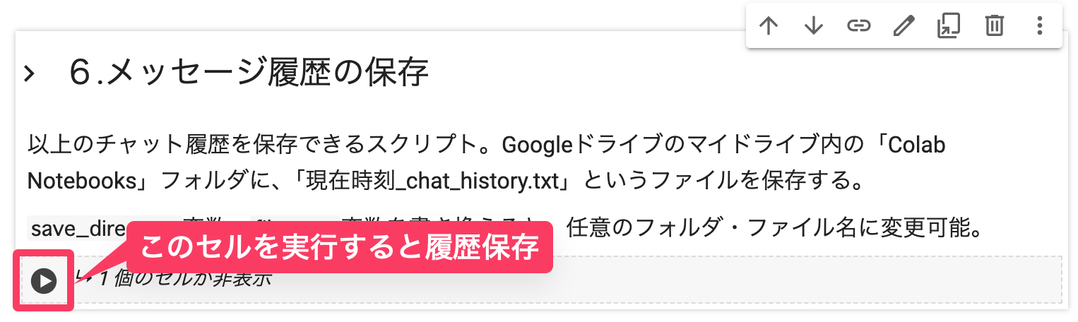 ノートブックの最下部にある「6.メッセージ履歴の保存」見出しのコードセルを実行すると、その時点でのClaude 3とのチャット履歴を、「現在時刻_chat_history.txt」と言うタイトルでテキストファイルとして保存する。