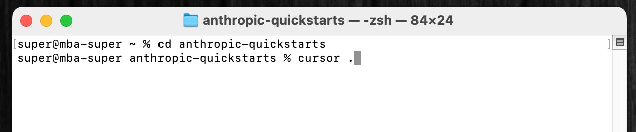 以下は、ターミナルからanthropic-quickstartsフォルダを開いて、それをCursorで開くためのコマンドである。