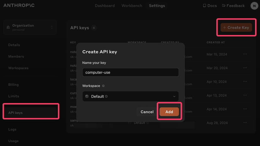 また、Computer use機能はAPIとして提供されているので、Claudeを開発するAnthropic社の開発者アカウントを作成して、自分のAPIキーを発行する必要がある。
