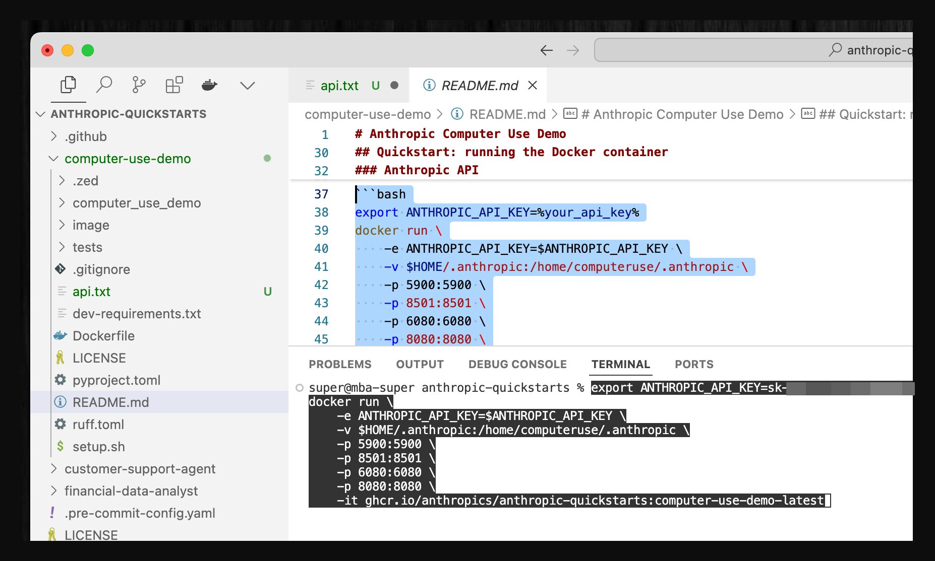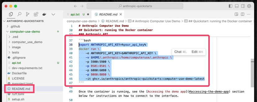 まず、computer-use-demo/README.mdを開き、38〜46行目にかけて表示されているバッシュコマンドをコピーする。