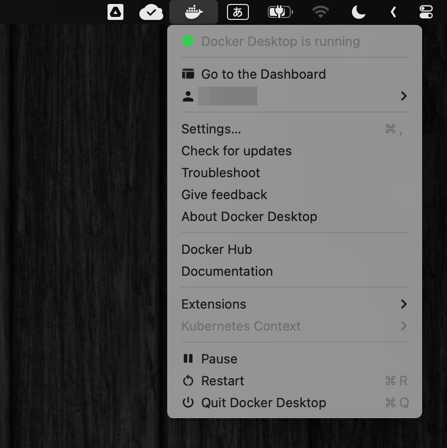 その際、Dockerが起動している状態でないとエラーが生じて実行が止まってしまうので、Macであればメニューバーのアイコンを見て、Dockerが起動していることをチェックしておく。