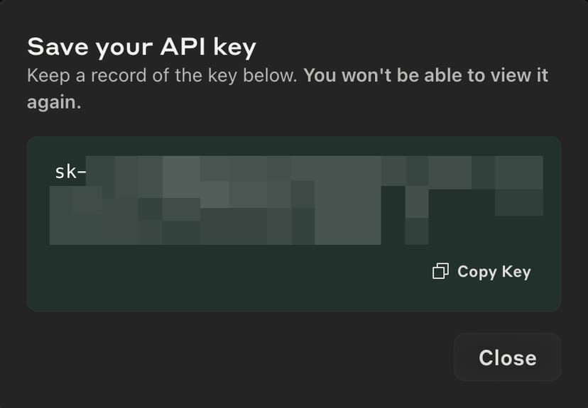 APIキーを作成したら、1度だけ表示されるので、どこかにこのキーをメモっておく。あとで使用するので、無くさないようにしよう。